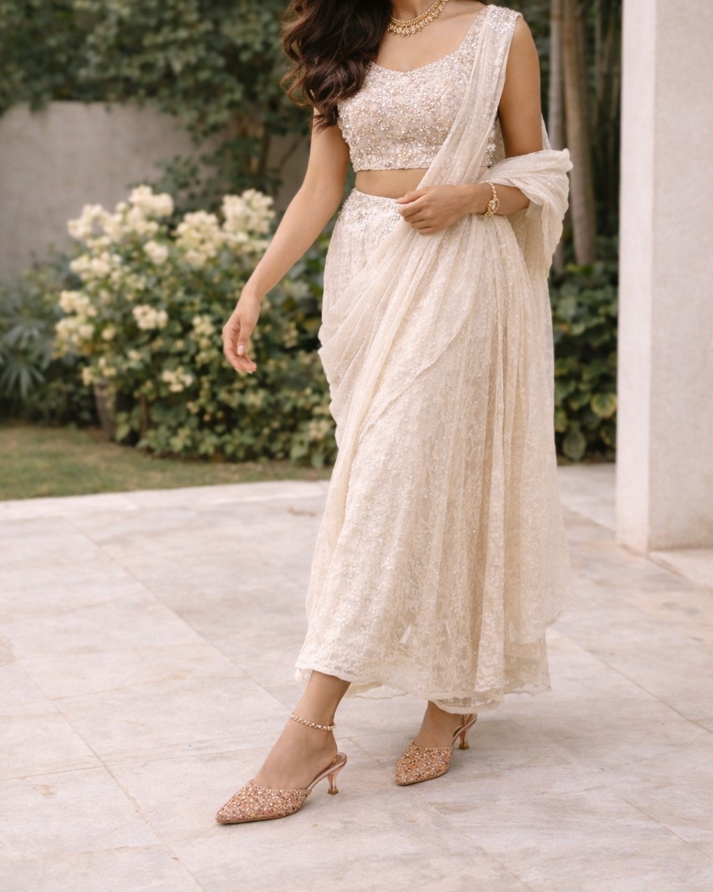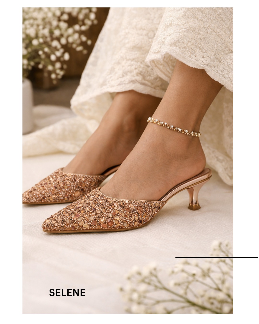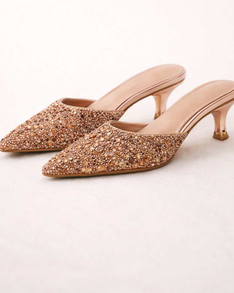 Adorned with intricate hand-placed crystals, beads, and stones, the upper glistens beautifully, reflecting light like fine jewellery. The luminous rose gold tone brings a regal warmth, making it the perfect companion for your most treasured occasions. Every detail feels intentional, luxurious, and timeless.